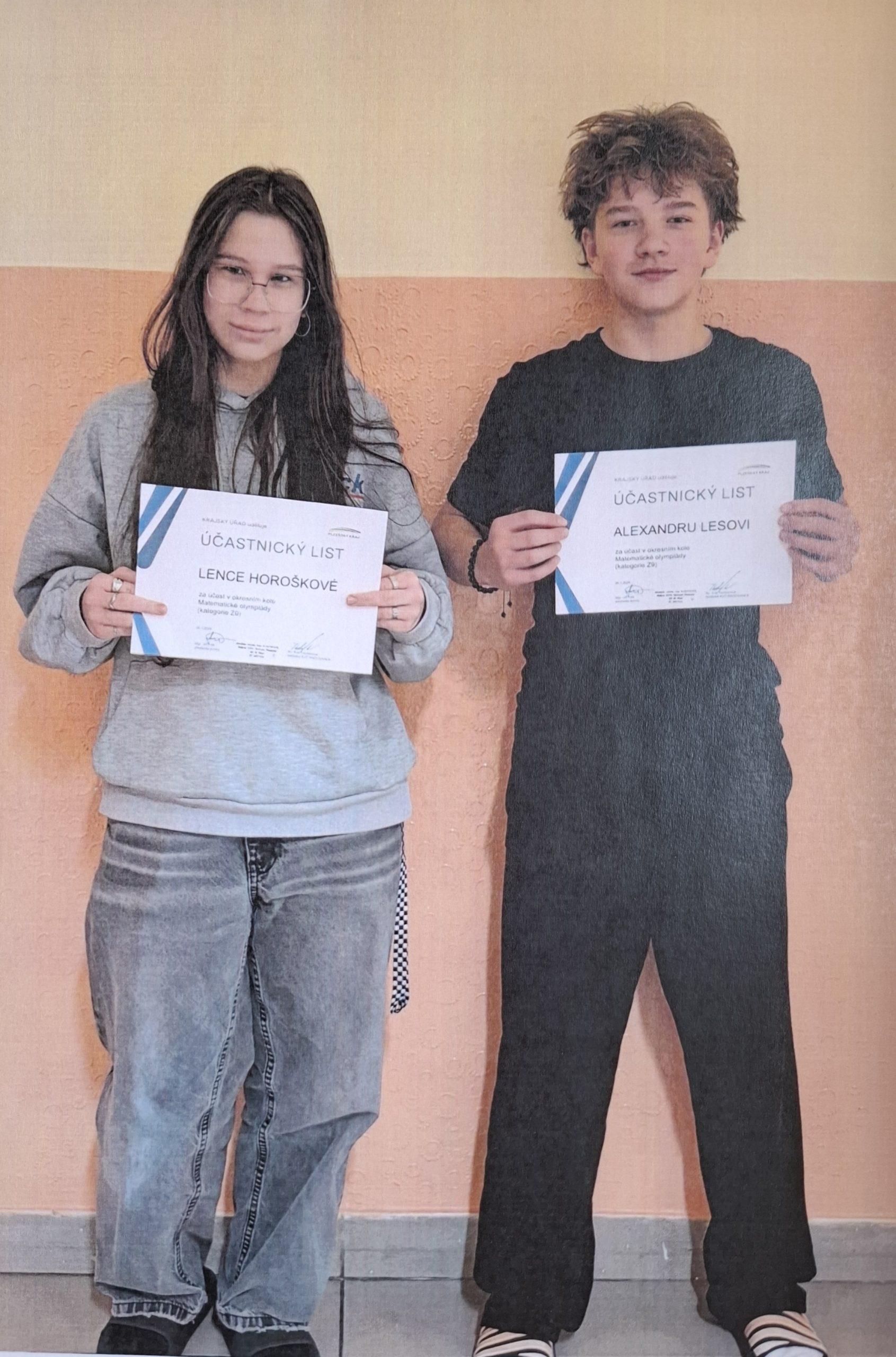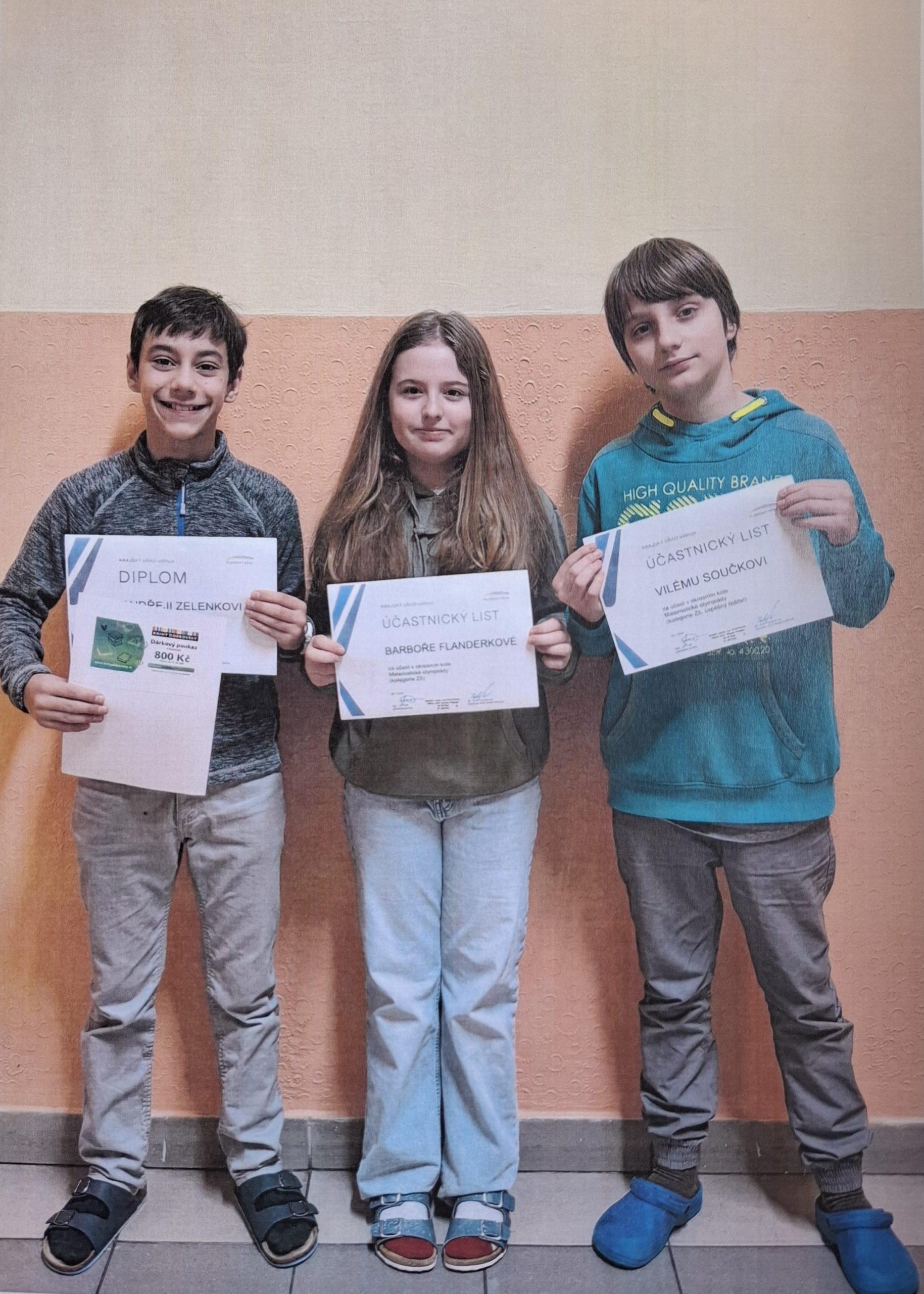 V pondělí 26. ledna se tři páťáci a tři deváťáci vydali reprezentovat naši školu do okresního kola v matematické olympiádě do Plzně. Žáci pátého ročníku zaznamenali obrovský úspěch. Ondřej Zelenka s plným počtem bodů – 18 získal dělené první místo ještě s jedním soutěžícím z jiné školy, který také měl plný počet bodů. Odměnou za svůj skvělý výkon získal poukázku v hodnotě 800 Kč do knihkupectví Dobrovský. Další zástupce páťáků byl úspěšný řešitel Vilém Souček se ziskem 12 bodů. Třetí účastnicí z páté třídy byla Barbora Flanderková. Deváťáky reprezentovali – Alexandr Les, Jan Sála a Lenka Horošková. Všem moc a moc gratulujeme.