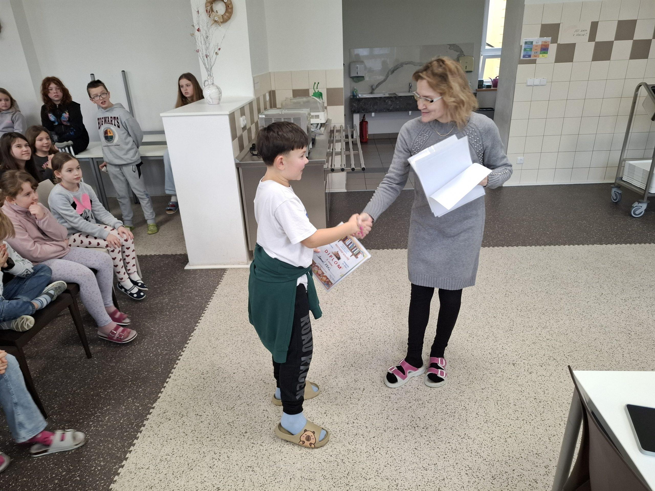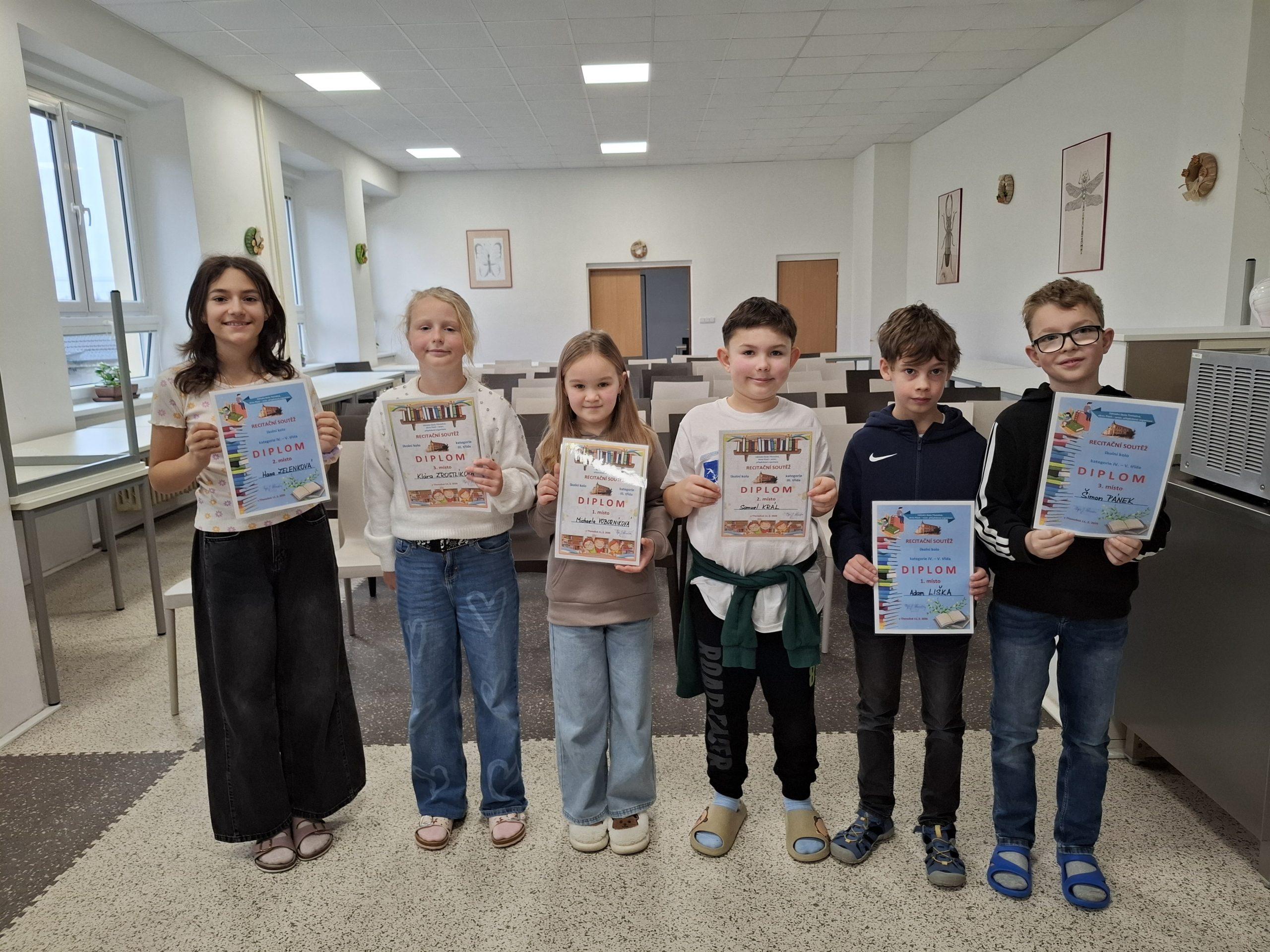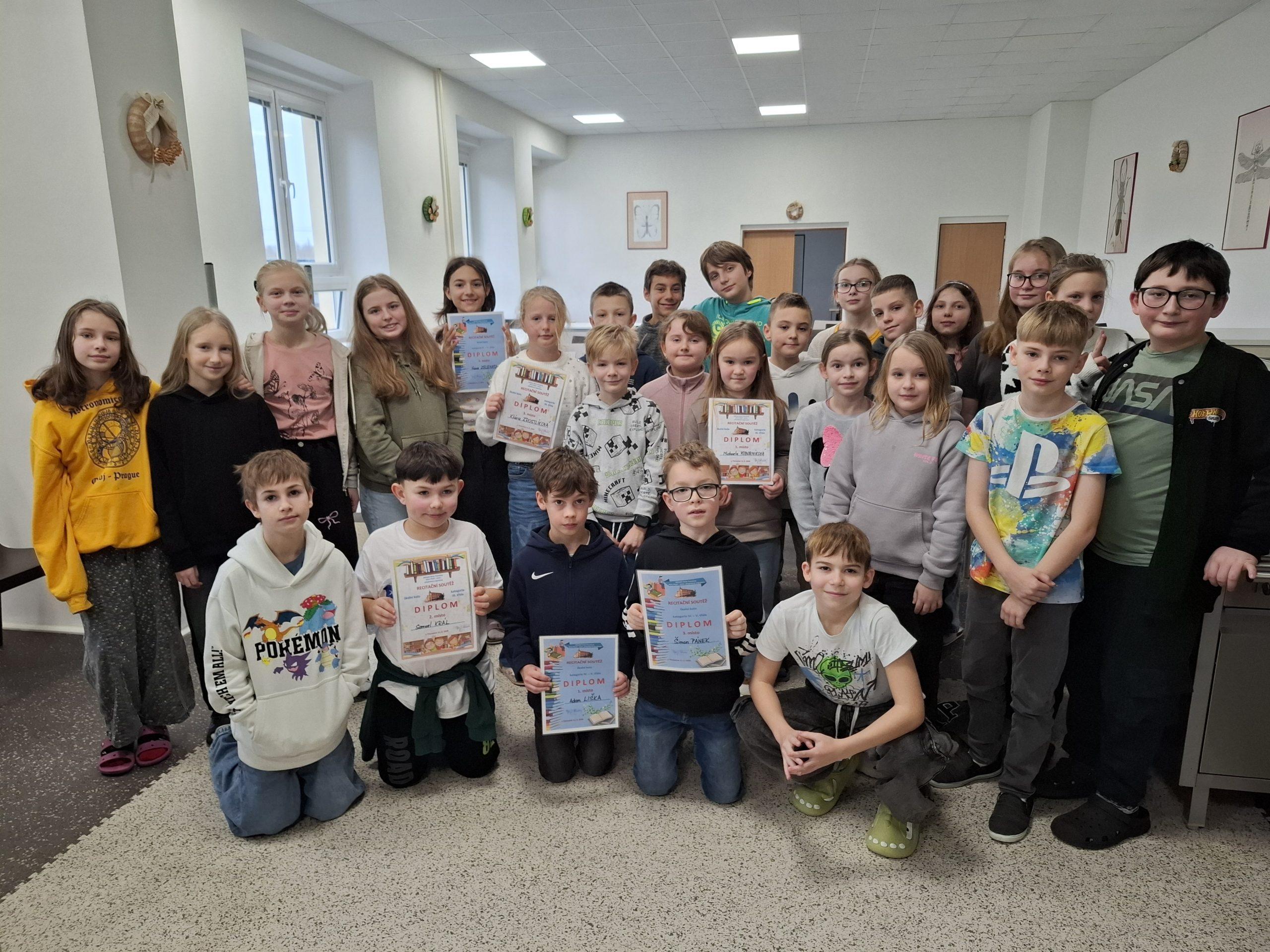 Ve středu 11. 2. 2026 opět proběhlo školní kolo recitační soutěže. Žáci 3. – 5. ročníku si vybírali z velkého množství básniček, které jim nabídly třídní učitelky nebo si mohli vybrat ze své knížky nebo z internetu a pečlivě se připravovali. Pět nejlepších recitátorů z každé třídy předvedlo své dovednosti ve školním kole. Všichni účinkující byli odměněni potleskem. Nejlepší tři v každé kategorii byli oceněni diplomem. Dva žáci, umístění na prvních dvou místech, z každé kategorie postupují do okresního kola do Kralovic. Všem moc gratulujeme.