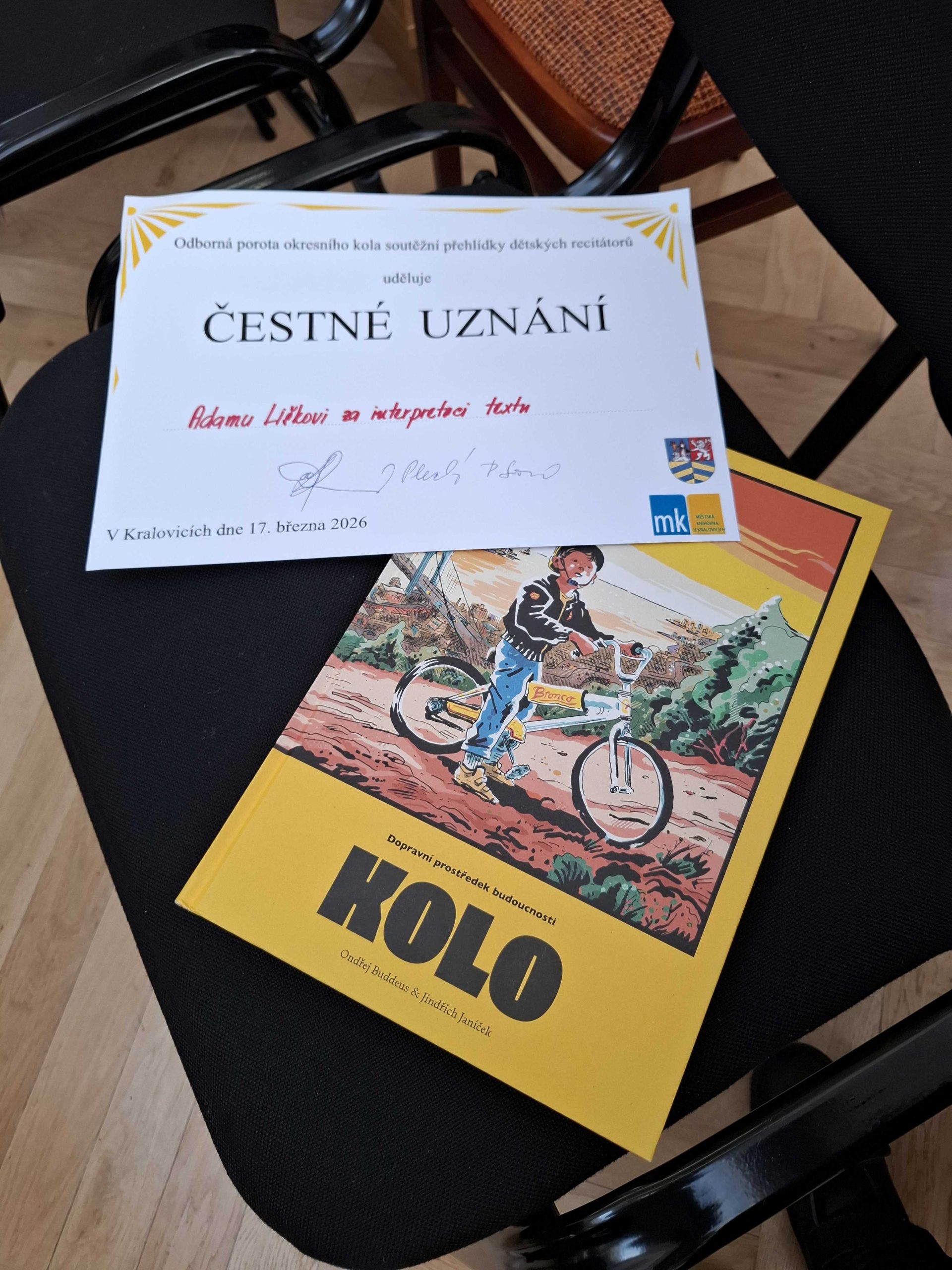 Se šesti žáky jsme se vydali reprezentovat školu v recitaci do Kralovic. Okresní kolo recitační přehlídky se opět konalo v nádherných prostorách kralovické knihovny, která kouzlo přednesu všech žáků umocňovala. V každé kategorii nás reprezentovali dva žáci, v kategorii 0 – Ester Sýkorová a Eliška Vosecká z I. B, v kategorii 1 – Tomáš Turek z II. B a Michaela Voborníková z III. B, v kategorii 2 – Adam Liška z IV. B a Hana Zelenková z V. A. Všichni předvedli skvělý výkon, ale na postup v obrovské konkurenci to nestačilo. Kromě postupujících byla v jednotlivých kategoriích udělována čestná uznání, které z našich žáků získal Adam Liška. Tříčlenná porota, jejíž členkou byla i autorka knížek o zvířátkách Dana Raunerová, neměla vůbec jednoduchou úlohu. Všem moc gratulujeme k velmi úspěšné reprezentaci školy.